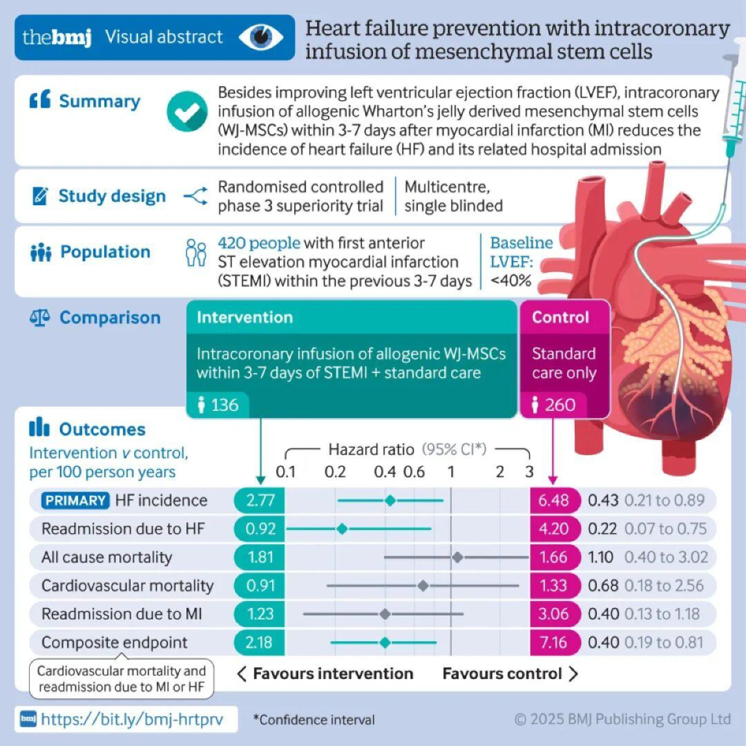 BMJ Ⅲ期研究:心梗后7天内单次脐带干细胞治疗,三年心衰风险降57%